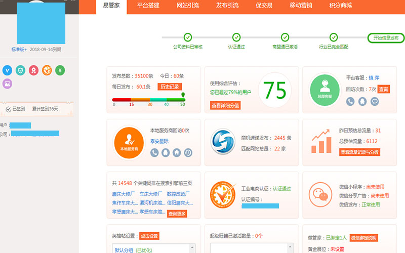 **机械公司在2016年6月份开通易站通,在一年半的时间内,一万四千多个关键词排在搜索引擎前三页,很多主打关键词都排在百度首页,正因为选择易站通,客户在2017年年底从网上接到十几万的业务,让客户更加坚定的选择易站通。