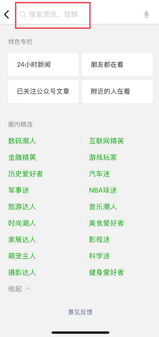 看一看还新增了一个「特色专栏」和「圈内精选」2 个小板块。特色专栏包括了「24 小时新闻」、「朋友们都在看」、「已关注公众号文章」和「附近的人在看」。圈内精选则由「时尚潮人」、「互联网精英」、「游戏玩家」、「产品经理」等 18 个栏目组成。