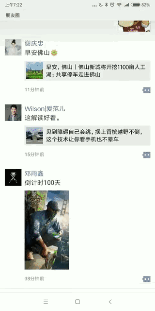 只是 Android 版状态栏「朋友圈」3 个字居左,而 iOS 版本的顶部状态栏居中。类似效果同样出现于公众号。