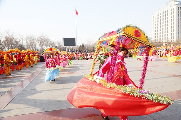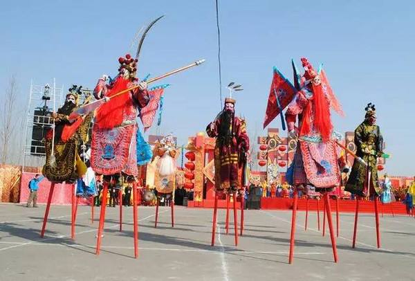 前边好多人啊,一起去看看吧,踩高跷的、划旱船的好不热闹。